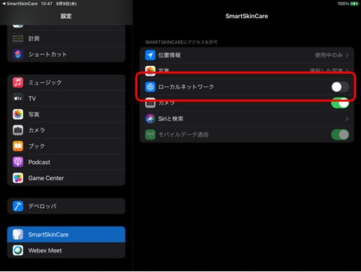 その場合は、OSの設定アプリから「SmartSkinCare」にある「ローカルネットワーク」をONにすると接続が可能となります。