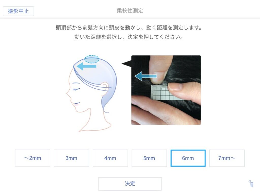 メモリを用意していただき、頭頂部から前髪方向に頭皮を動かし、動いた距離を測定します。
