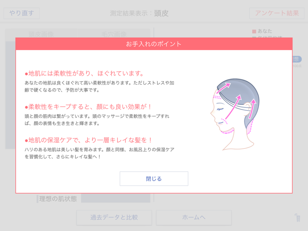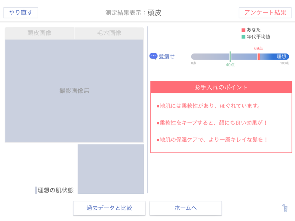 測定結果画面が表示されます。結果の棒グラフとお手入れのポイントが確認できます。