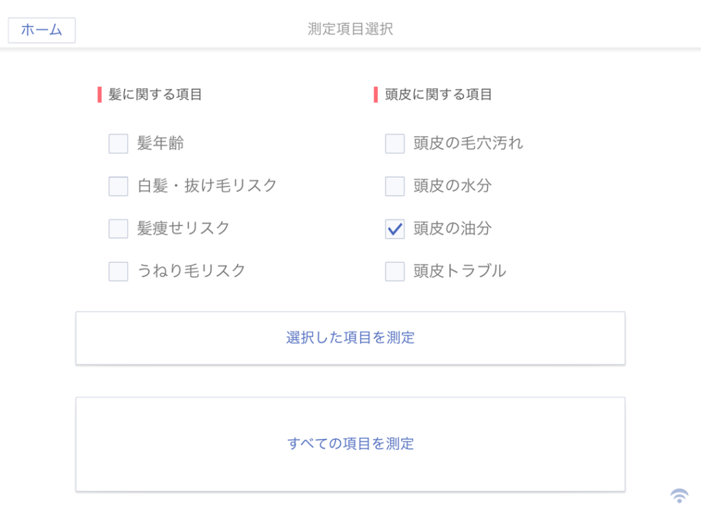 測定項目選択画面で「頭皮の油分」にチェックを入れて「選択した項目を測定」を選択します。