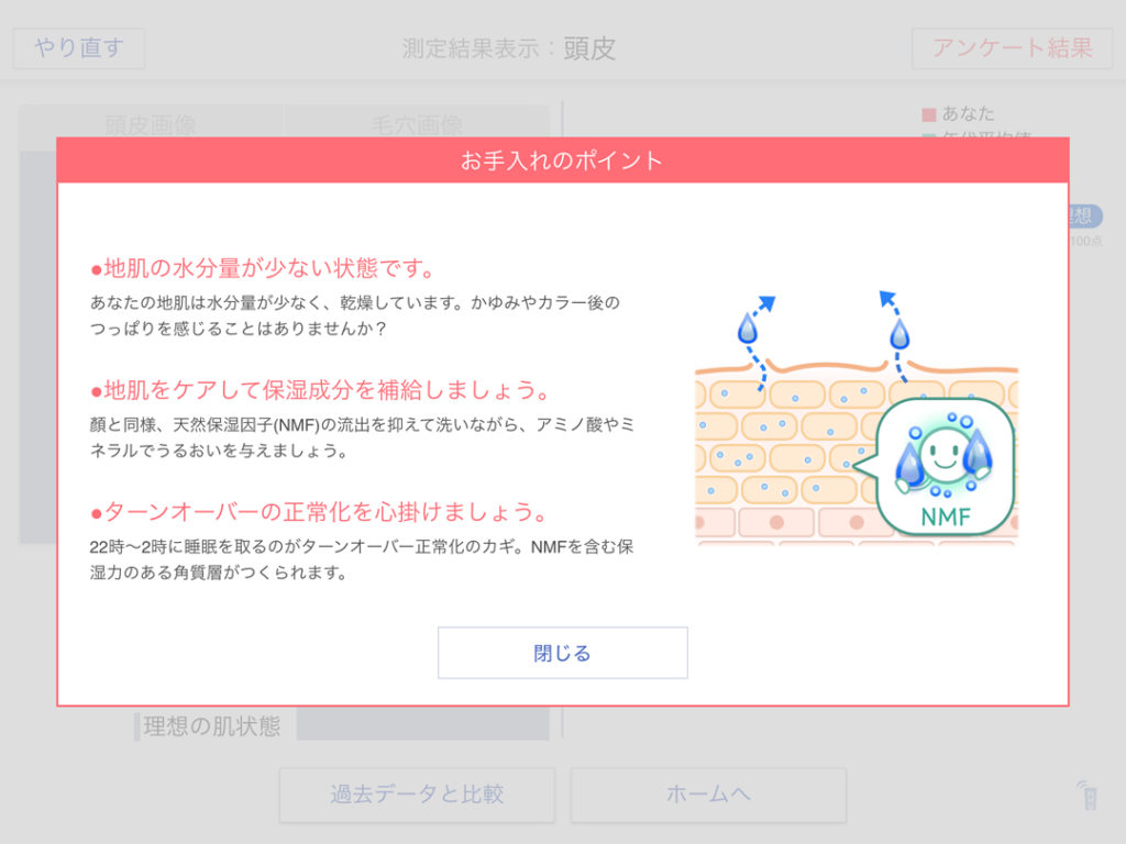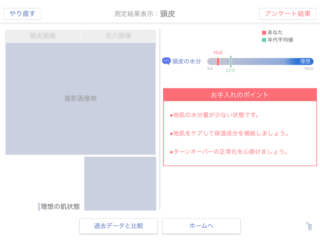 測定結果画面が表示されます。結果の棒グラフとお手入れのポイントが確認できます。