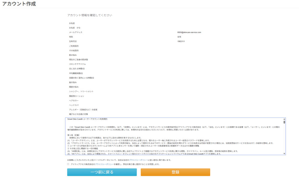 入力内容を確認し問題なければ、プライバシーポリシーにチェックを入れて登録を完了してください。登録したメールアドレスにユーザー登録完了のメールが届きます。