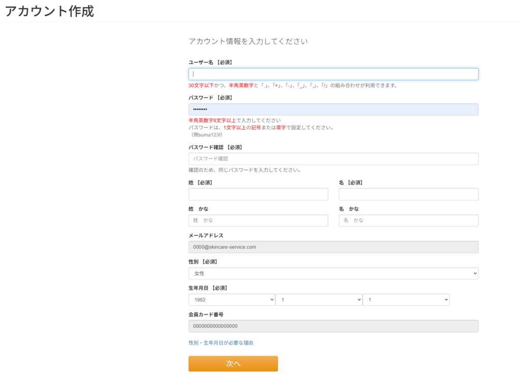 会員登録フォーム録フォーム以下を入力して「次へ」を選択します。