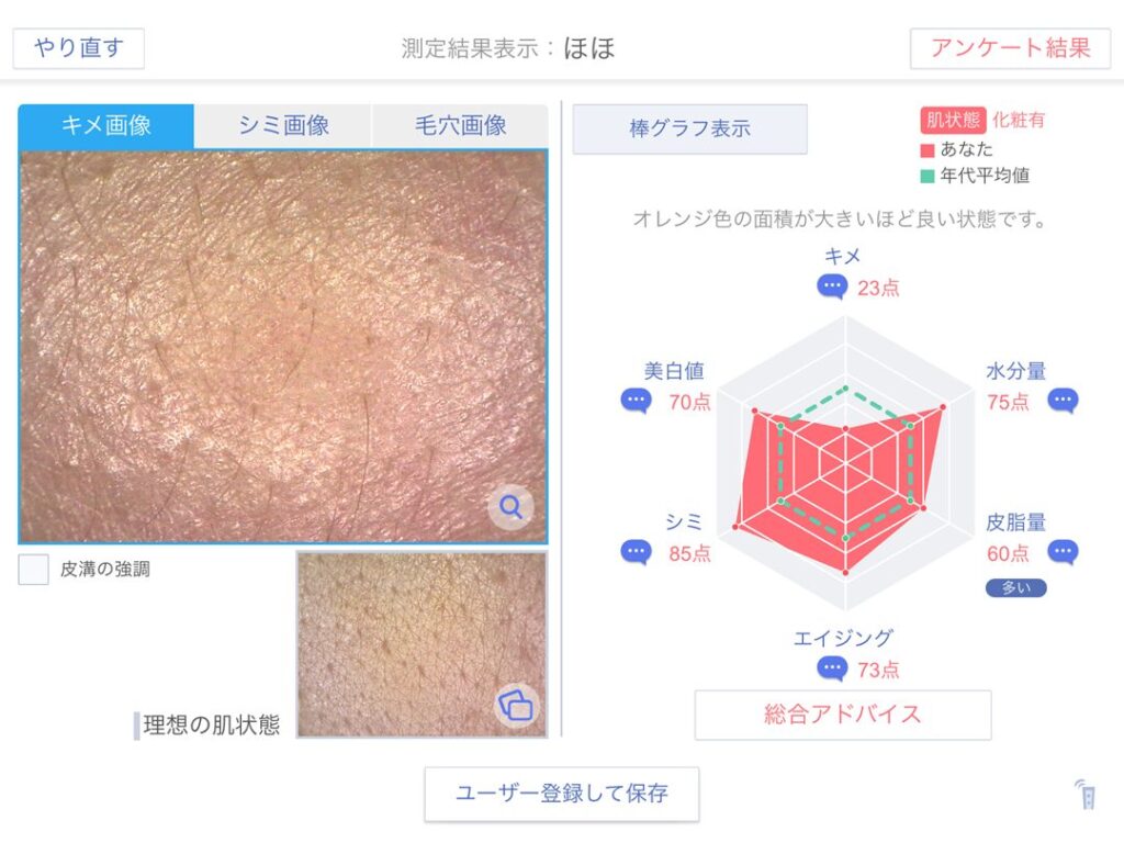 測定結果画面にて、「ユーザー登録して保存」ボタンを押下します。